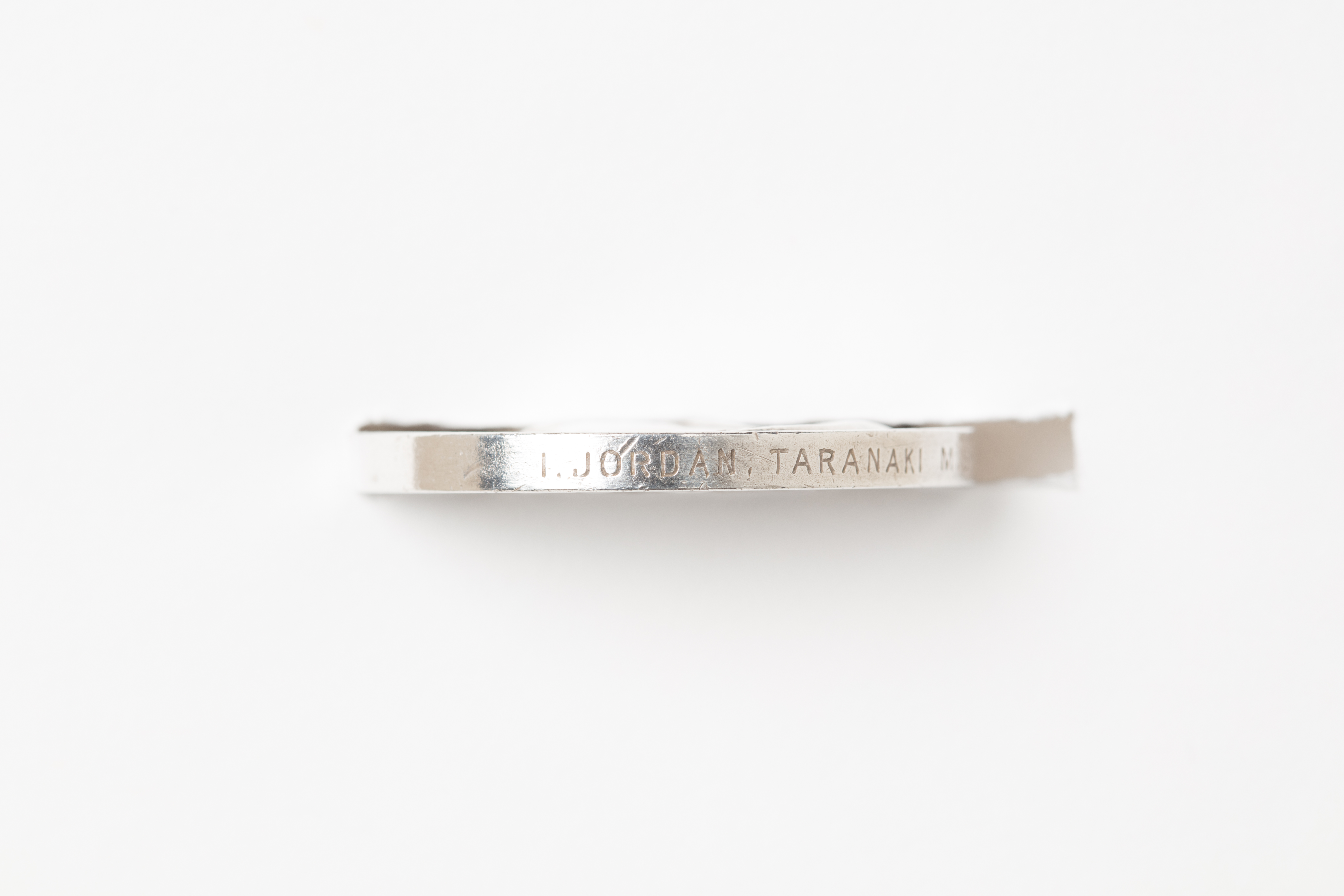 English: New Zealand Medal, New Zealand Wars (1860-1872) undated Medal awarded to Private Israel Jordan, Taranaki Military Settlers. circular silver medal; straight ornamental (fern fronds) swivelling suspender; ribbon 1995-1996- ribbon missing obverse- diademed head of Queen Victoria with a veil covering the back of her head; around the head is the legend- VICTORIA - D - G - BRITT - REG - F - D reverse-laurel wreath and legend above and below- NEW ZEALAND - VIRTUTIS HONOR (Honour of Valour) named in block capitals on edge- I. JORDAN. TARANAKI M.S. |